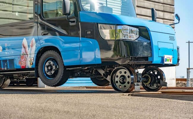 ويمكن لهذه المركبة ذات الوضع المزدوج، أو DMV، أن تتحول من حافلة تسير على الطريق إلى قطار يسير على المسار في 15 ثانية بفضل العجلات الفولاذية التي يمكن إنزالها على المسار بضغطة زر.